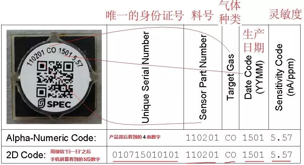 所有的气体传感器都是测试了的,且在SPEC Sensors工厂标示了的.传感器包含了一个字母数字码的标签,和二维码。此码包含了下表的信息