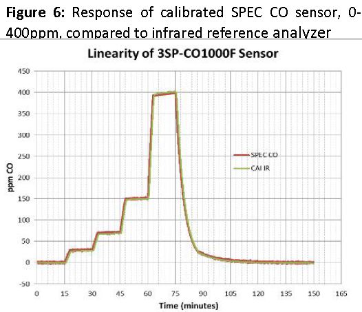 在很宽范围的浓度是线性的,级数的三阶量级之后才会有误差(和红外一氧化碳传感器的对比),所以,校正只需要一个单一的气体即可完成.推荐浓度靠近动态范围的中间的时候校正.