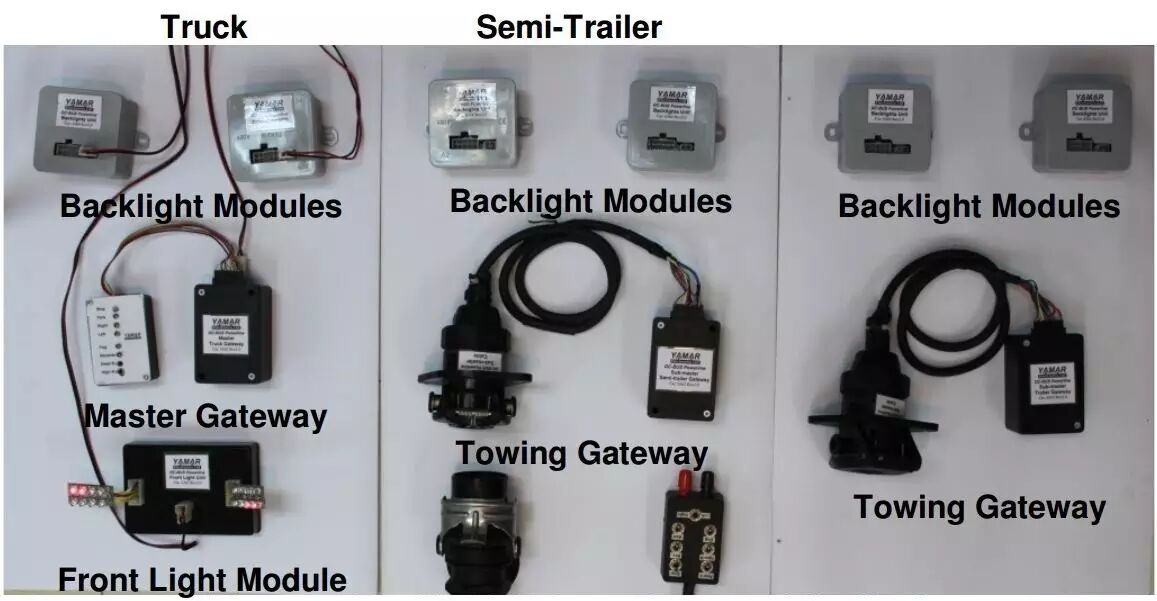 innotruck电力线照明控制系统由前灯模块和六个尾灯模块组成:卡车,拖车和半拖车的左后和右后边各有两个模块,YAMAR研发了两个网关,其任务就是将现在的iSO-1185接头的尾灯状态翻译成电力线命令,激活innoTruck的尾灯。图3描述了为inno truck定制的照明系统。
