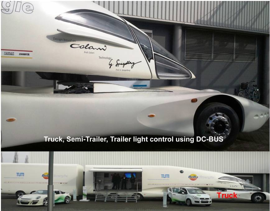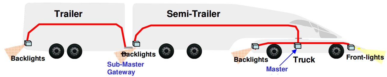 卡车拖车的线束由许多线材组成,用于激活简单的前后的开关功能比如照明。这些线材是笨重的,体积大和昂贵的。由戴姆勒发起的EU SPARC项目中,使用电力线来控制卡车和其拖车的尾灯的新概念极大地节省了线材的数量。